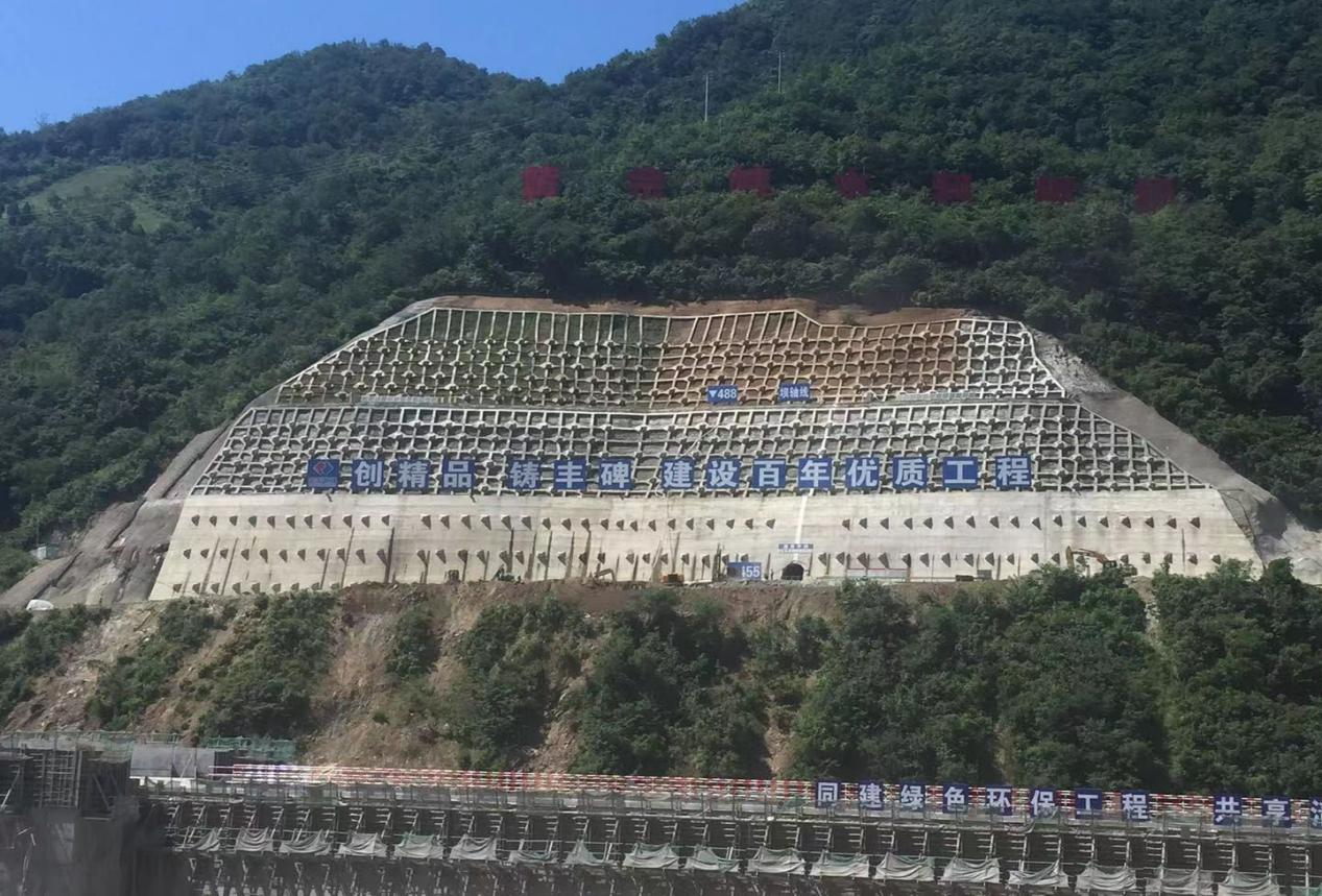 本工程試驗區位于黃金峽大壩右岸壩肩框格梁混凝土邊坡內,高程范圍為EL488m~EL512m,坡度接近1:0.35,框格梁尺寸約為2m*2m,預留排水孔,面積約7000㎡。2018年12月,經項目部相關部門多方調研后,最終選用三峽大學潤智生態科技研究院的專利技術—植被混凝土生態修復技術對右壩肩框格梁邊坡以及其延伸段的一塊混凝土邊進行“引漢濟渭生態修復試驗工程”示范。如下圖所示: